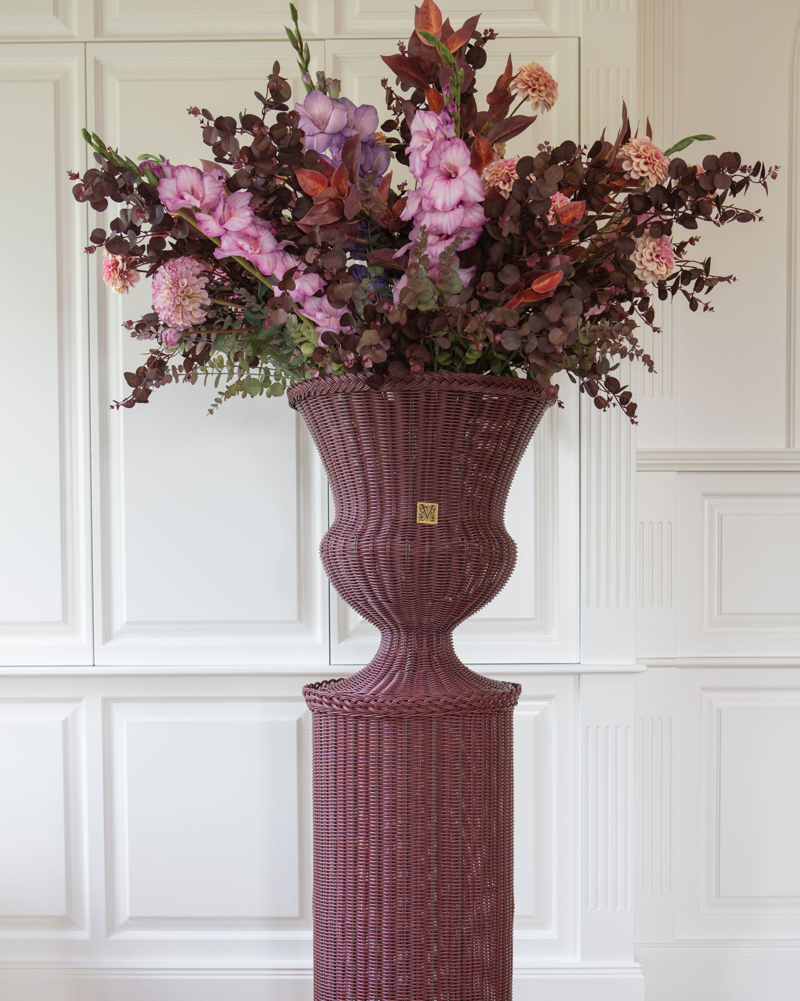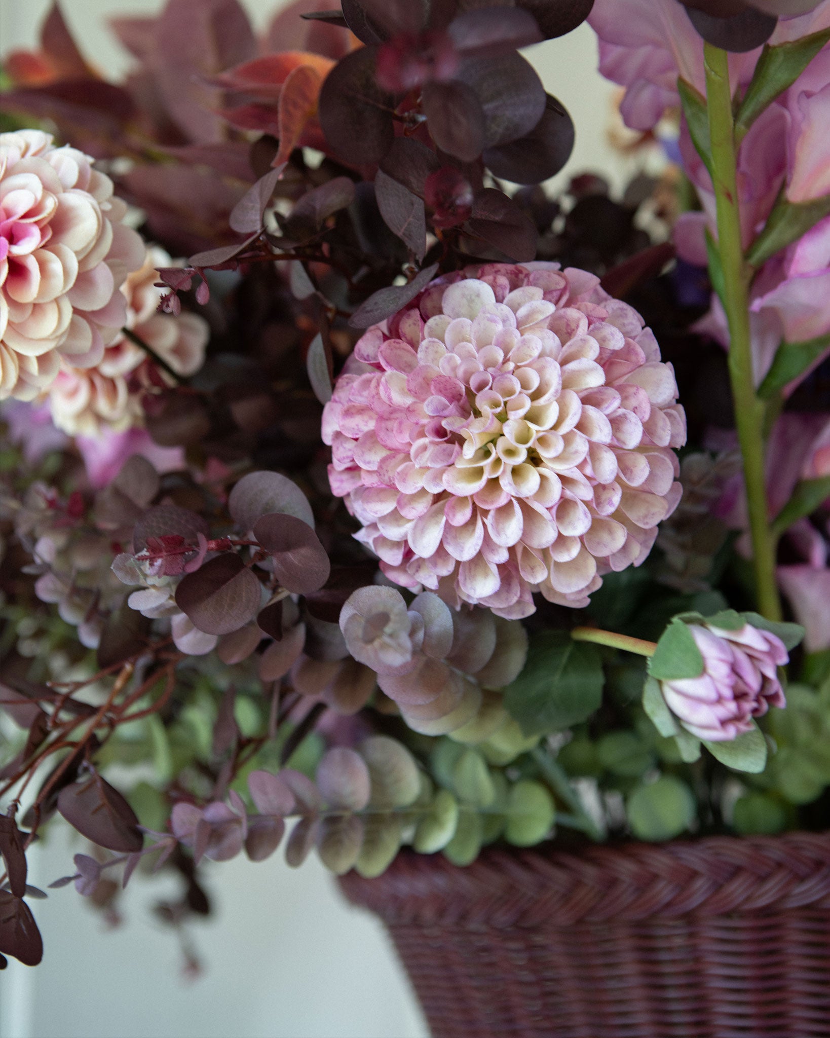 Besonders harmonisch wirkt die Komposition in Kombination mit der MEDICI-Vase in Bordeaux – sie verstärkt die Wärme und Tiefe der Blätter, während die zarten Blüten in Rosa und Lavendel elegant hervortreten.