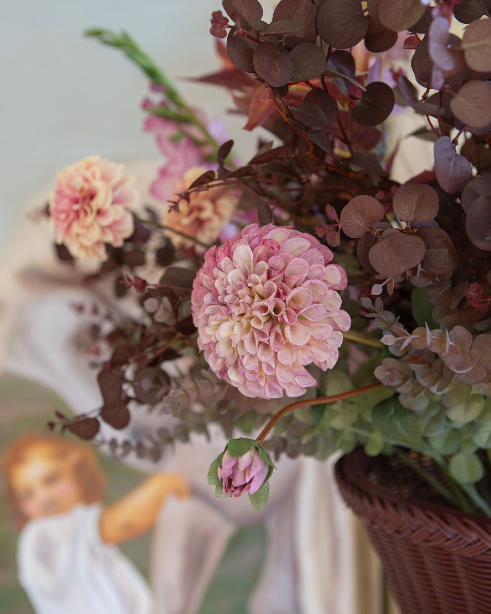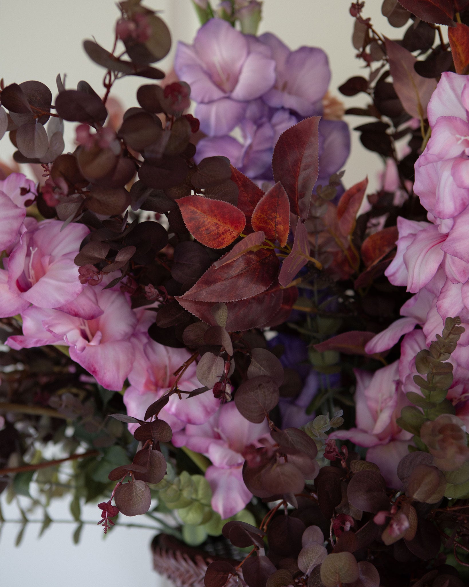 Die Zusammenstellung vereint prächtige Gladiolen in Rosa- und Lavendeltönen mit üppigen Dahlien in Pink und Blush, eingebettet in burgunderfarbenen Eukalyptus und tief bordeauxrote Blätter. Feine Pimpernelzweige setzen spielerische Akzente und verleihen der Gesamtwirkung Leichtigkeit und Raffinesse.
